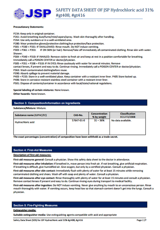 JSP Hydrochloric Acid 31% 16 Ounces / 1 Pound Gold Refining Aqua Regia