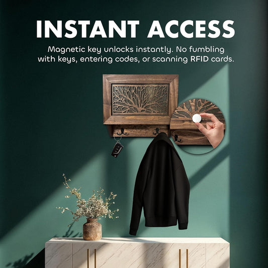 Gun Concealment Furniture - Deer Hunter Coat Rack Hidden Wall Safe with Hooks for Coats, Bags, & Hats - Quick Access Hidden Gun Storage - Wood Gun Cabinet with Secure Magnetic Lock