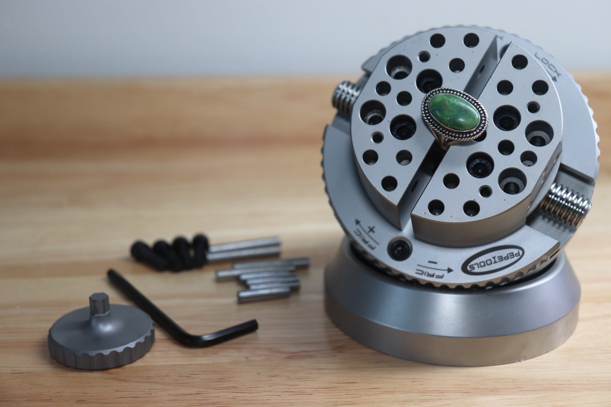 Introducing this new setters vice rotates hardened jaws with a large set screw for even, smooth, and proportional work holding of mini components from finished jewelry, rings, watches, and more. A flared stainless steel stand is felt lined for ease of rotation while maintaining positional accuracy, especially while working under a microscope. Adjustable jaws smoothly slide open from an oversized center screw and bronze bearings. Jaws close flush or can open to a max working area of over 40mm. 5mm pins can be inserted into the 5 holes on either jaw, with threaded additional holes to insert attachments. Two tension adjustment screws conveniently located at the top of the ball can adjust the rotational speed and lock the ball into place. Low profile, easily fits into the palm of your hand with enough weight for stability. This is made to last for generations.