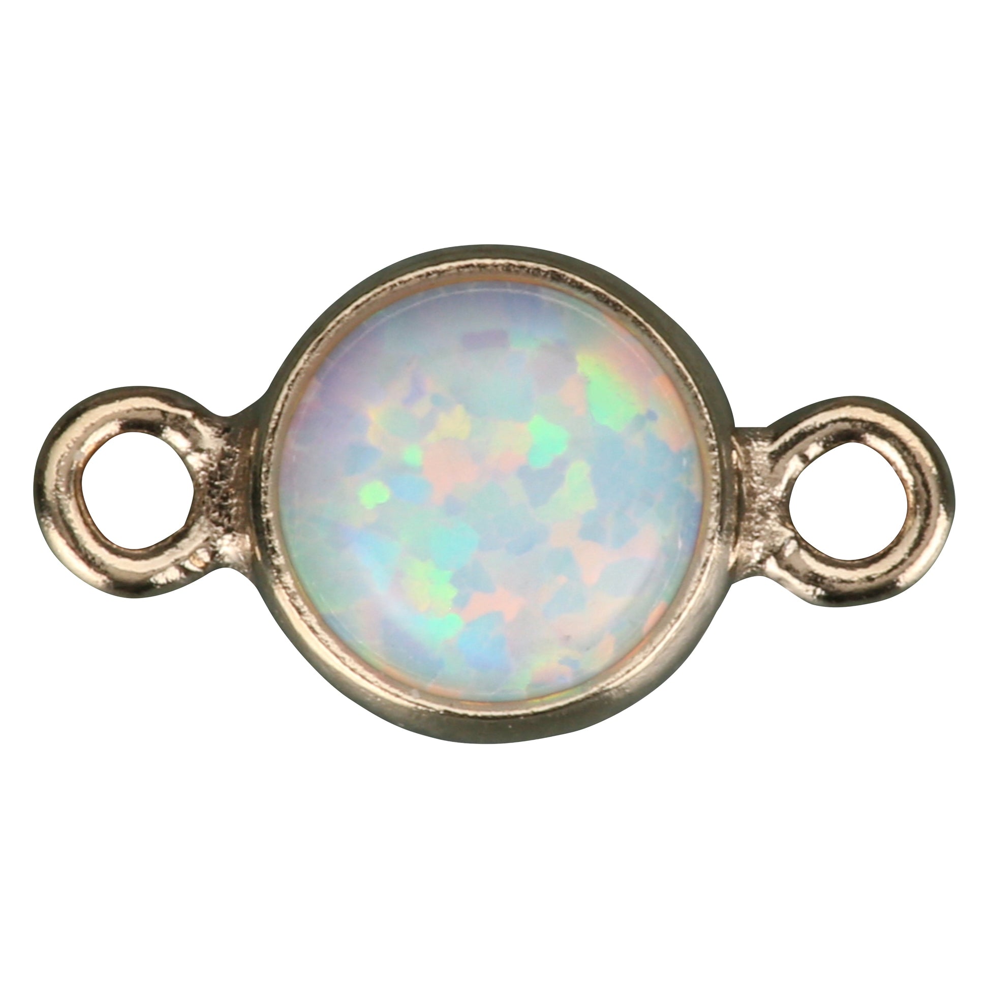 This 4MM connector is made from 14k gold fill. A synthetic, waterproof white opal is set in the center. The connector has a flat back to easily sit on the wrist or anklet during the permanent jewelry process. Measuring in at 4mm in overall diameter, it is dainty enough to work with chain up to 3mm in width. The jump rings on either side are closed, they can be looped through a connecting jump ring which then attaches to the chain when used with a professional pulse arc permanent jewelry welder.