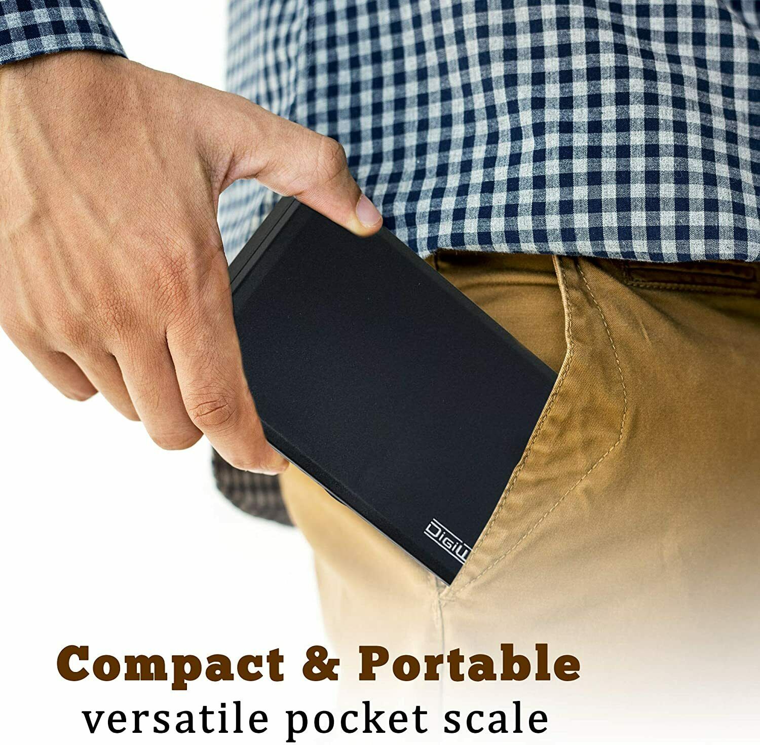 The 2.5" x 3" stainless steel platform offers a clean, reliable surface for weighing, while the compact body (just 5" x 3" x 0.75") makes it easy to take on the go or store in a drawer.