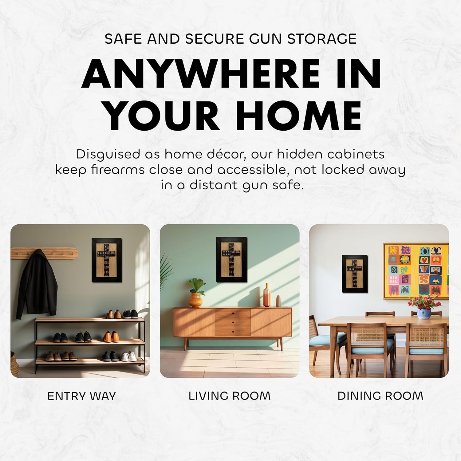 - INSTANT FIREARM ACCESS: Access your firearm instantly with this wall mounted gun safe. No fumbling with keys, codes, or RFID scanners. This hidden gun storage wall decor provides secure access and peace of mind when every second counts.
