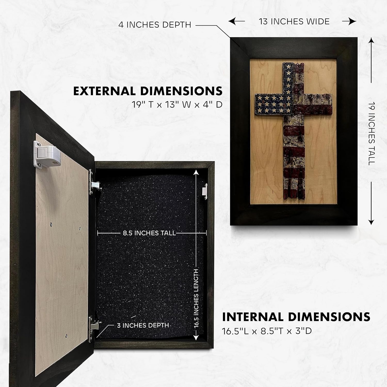 - PATRIOTIC & RELIGIOUS DECOR: This hidden gun safe is hand-carved in the USA with lasting durability and family-owned care. Featuring a mounted cross with the American flag design, this gun shelf combines secure storage with a bold expression of faith and patriotism.