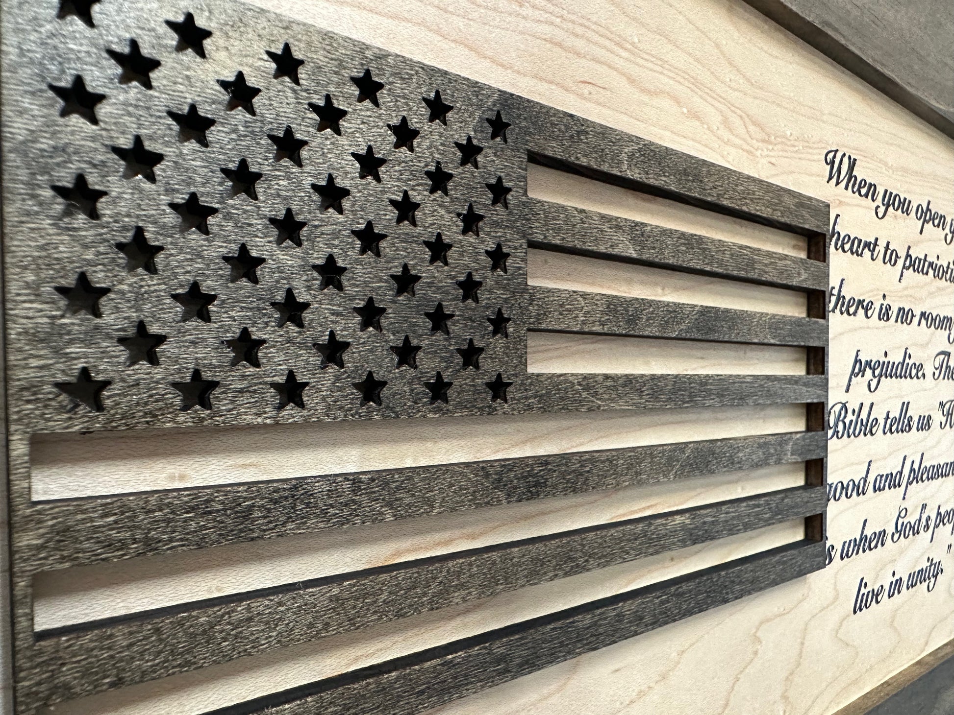 Securely store your gun and other home self defense gear inside the Bellewood Designs American Flag & Patriotism Decorative Wall-Mounted Secure Gun Cabinet. The American Flag is 3D and placed next to the saying "When you open your heart to patriotism, there is no room for prejudice. The Bible tells us "How good and pleasant it is when God's people live in unity." This decorative American Flag & Patriotism gun cabinet will be a beautiful addition to your homes decor, make a bold statement about your position on patriotism and no one will know what's inside! Your firearm and other tactical gear is easily accessible yet securely stored, so you'll never have to worry about leaving it unattended.