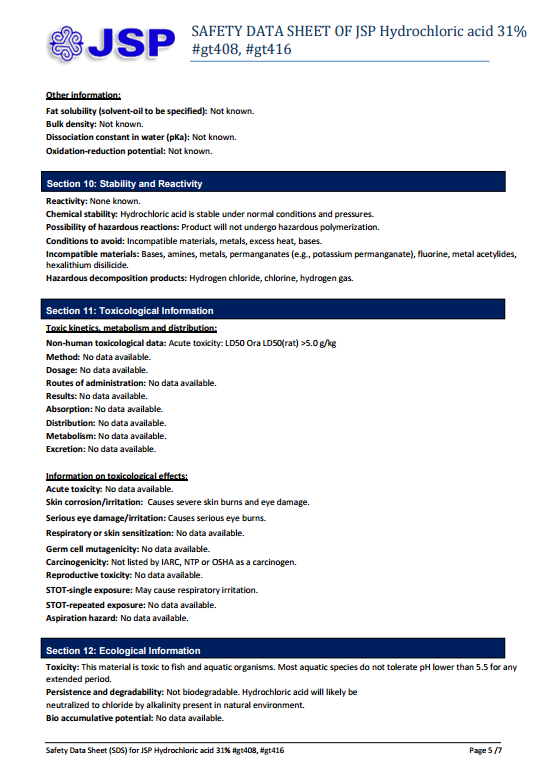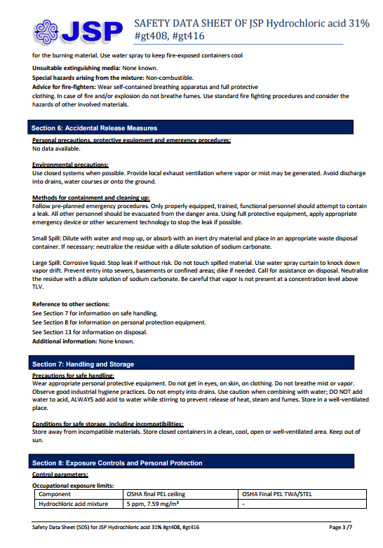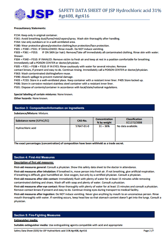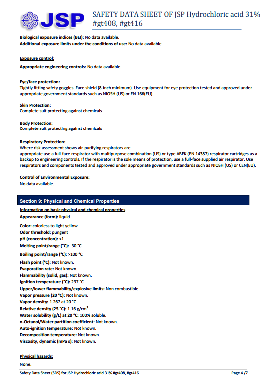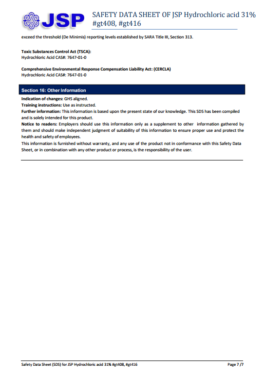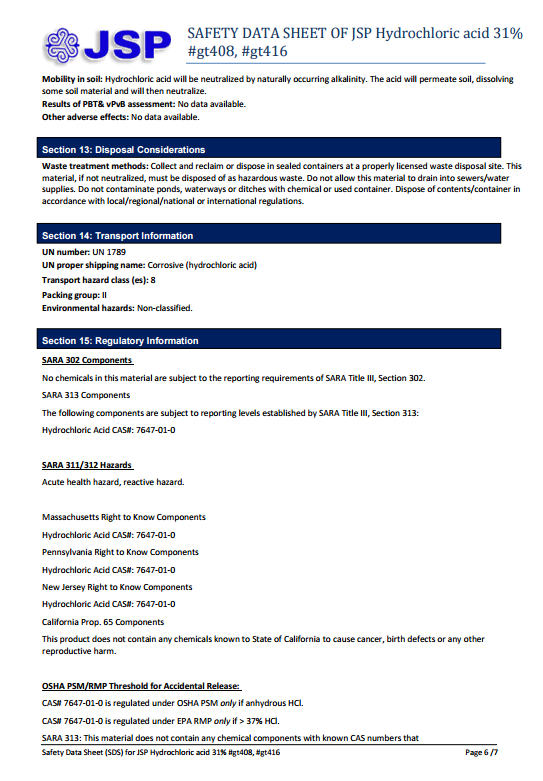 1 bottle JSP Hydrochloric Acid – 16 oz. (500 mL), 31% purity