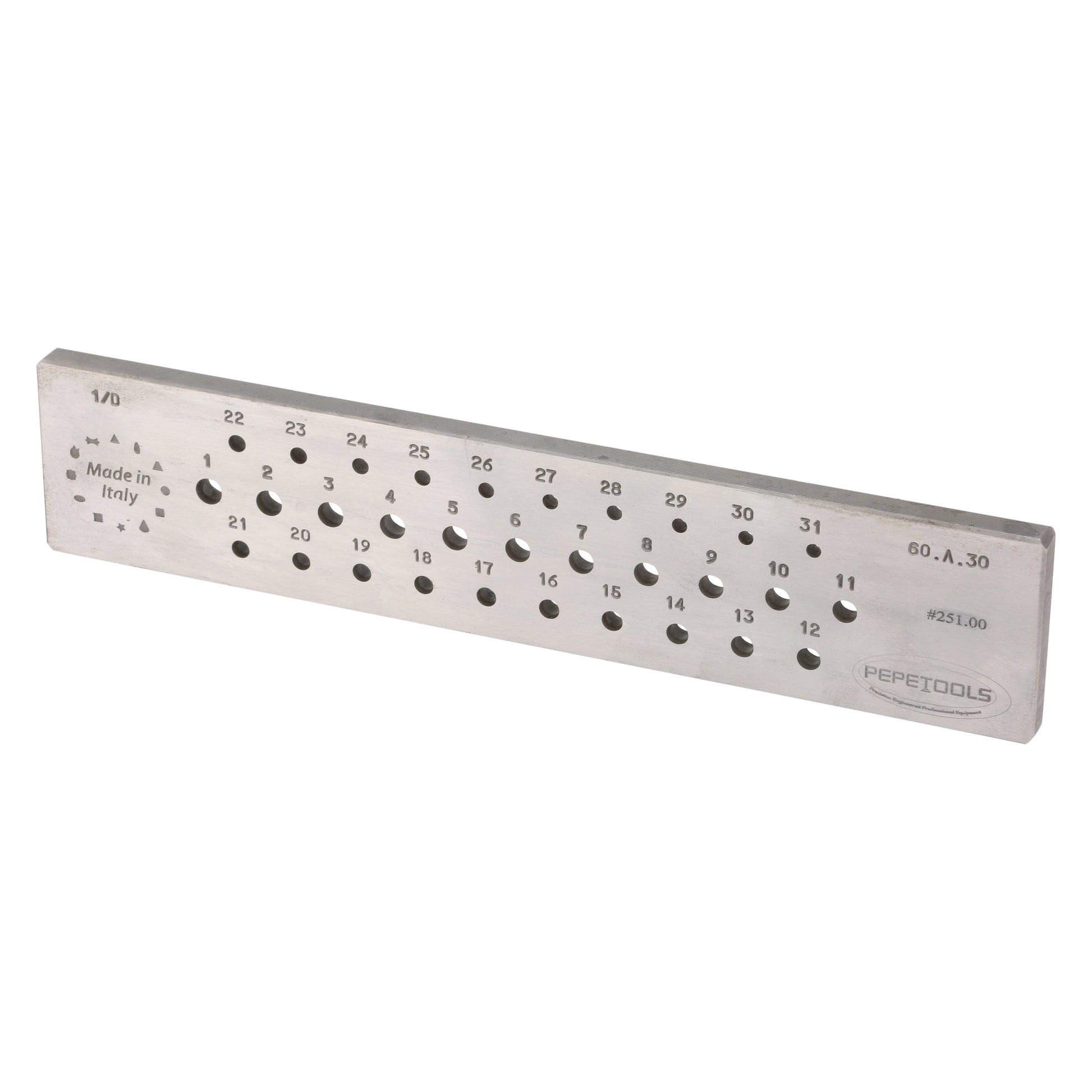 Achieve precise wire drawing results with this high-quality Round Wire Draw Plate. Manufactured in Italy to Pepetools specifications, this draw plate is precise and powerful. Made from hardened steel and accurately machined with smoothly beveled holes, this plate has 31 holes ranging from .236 (6mm) to .118" (3mm) in diameter (2 ga. - 8ga.). Get the results you need with the robust and reliable Round Wire Draw Plate.
