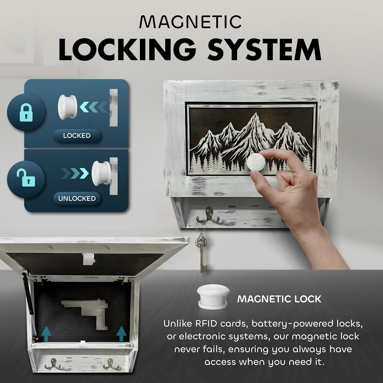 - SECURE MAGNETIC LOCK: This hidden gun storage uses a magnetic key system that never fails when needed most. Built for consistency, it gives you the dependable access hidden safes in plain sight are meant to provide, without the risks of battery or tech failure.
